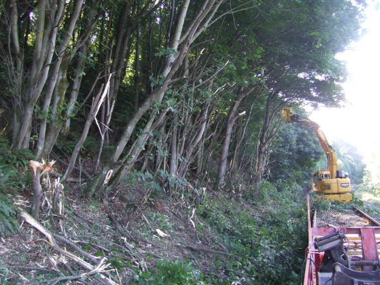 When overgrown vegetation encroaches the right-of-way, Herzog performs necessary brush cutting and tree shearing to ensure visibility for operators and avoid damage to rail infrastructure.